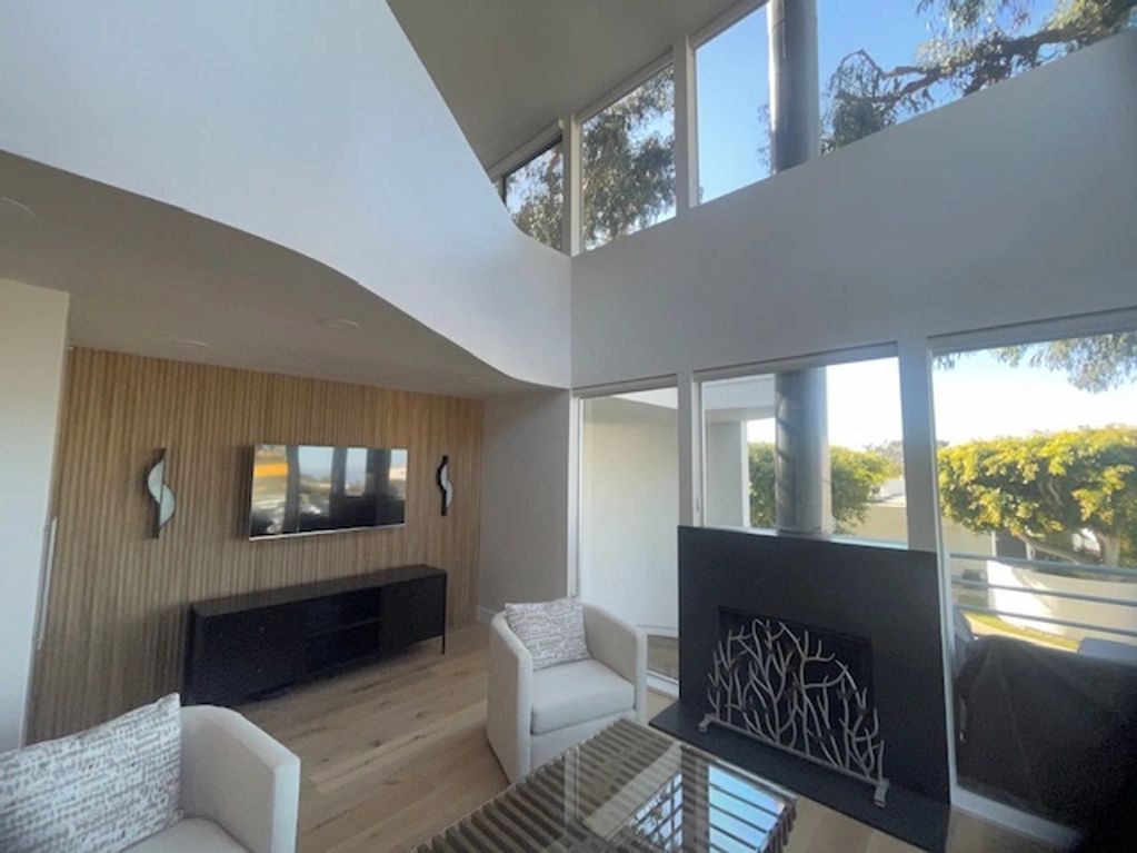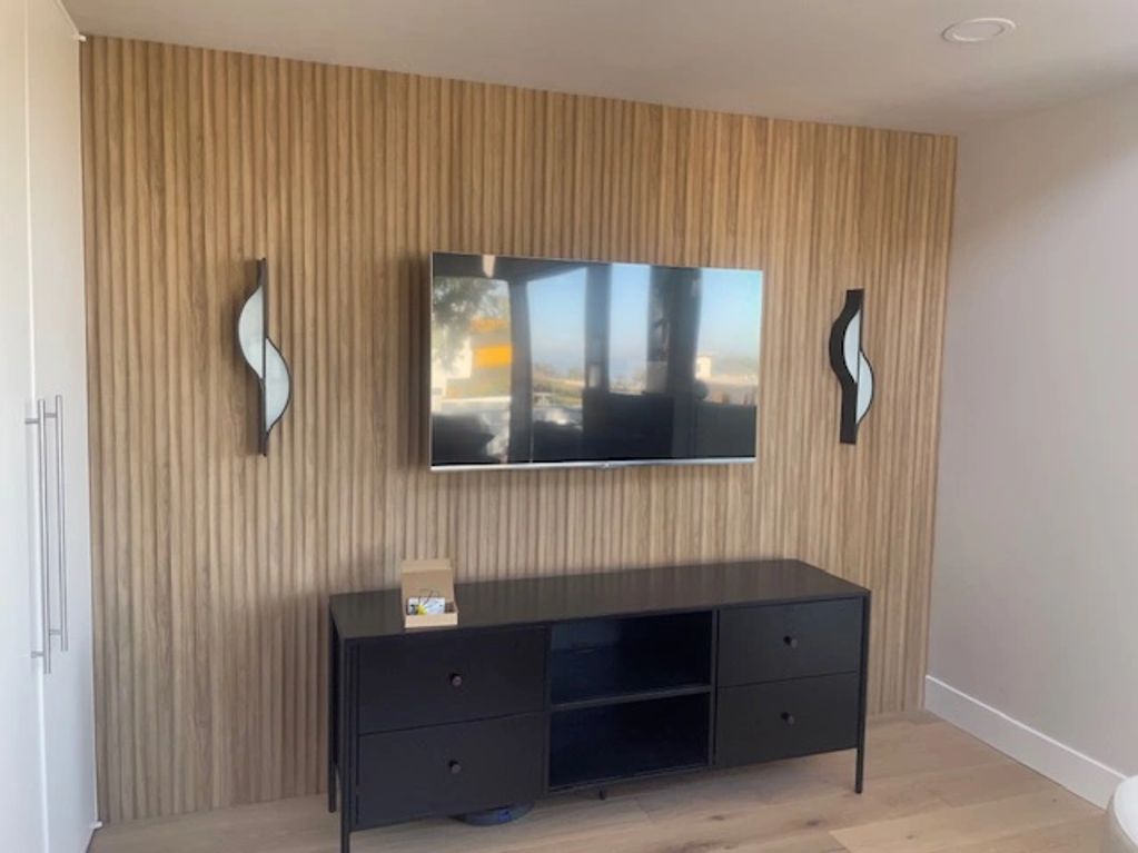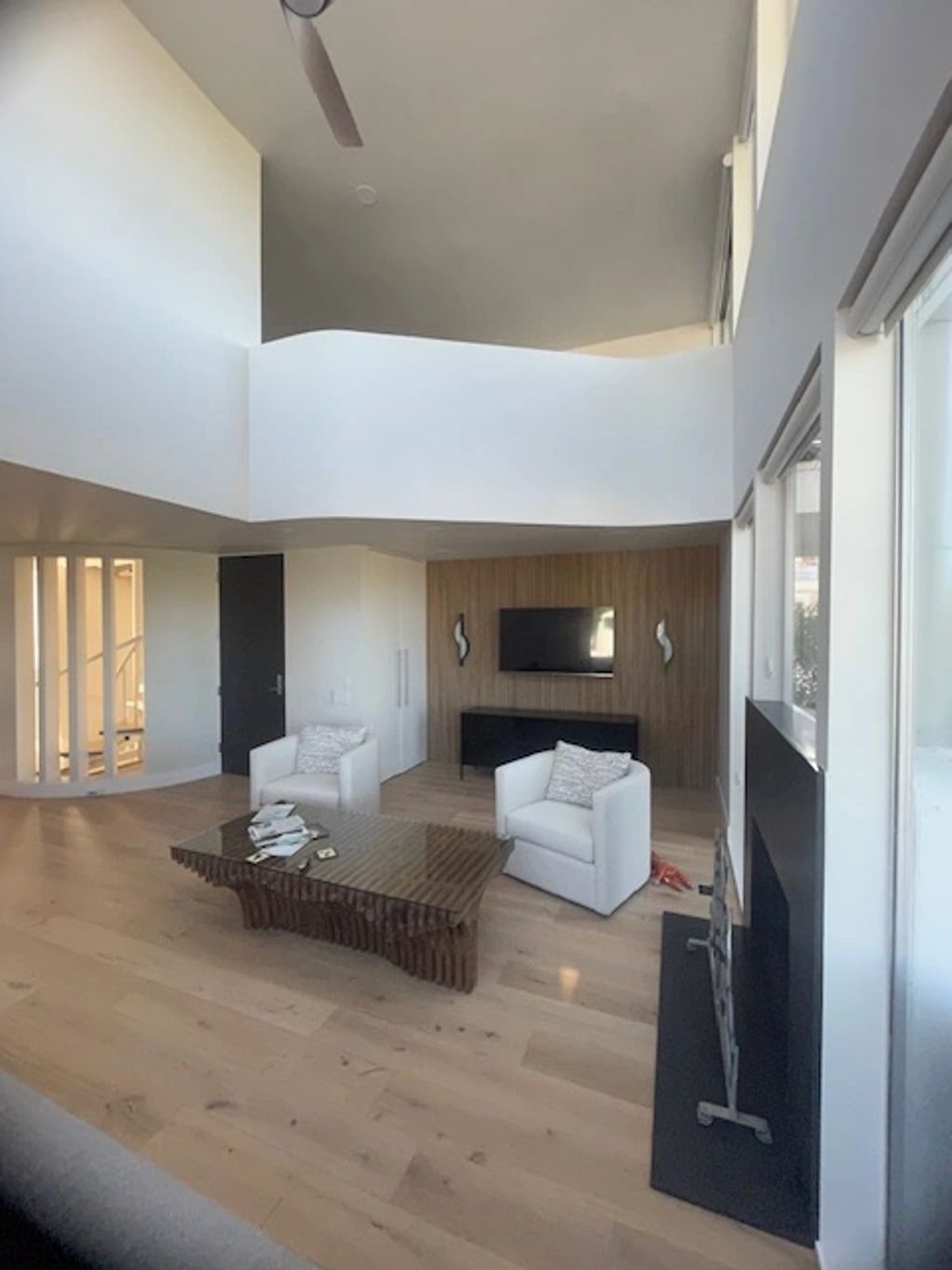Second floor living room conversion. French Oak eng wood flooring throughout. Walnut panel TV accent wall with sconces. New quartz fireplace surround and fireplace insert refinish.